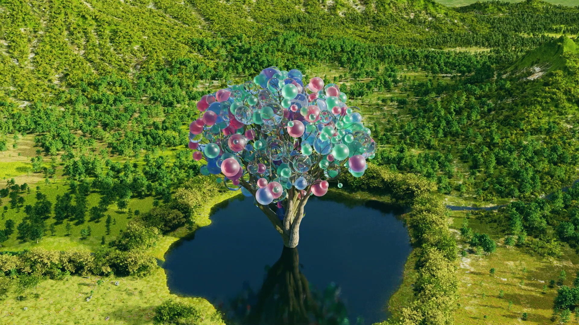 制作には長年愛用している 3DCG ソフト Blender を用い、物理シミュレーションやプロシージャルなモデリングを駆使しました。球体の有機的な変化や、木が芽吹く瞬間の繊細な描写を通じて、生命の持つダイナミズムと儚さを映像に込めています。